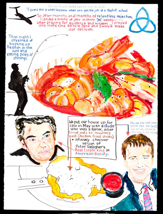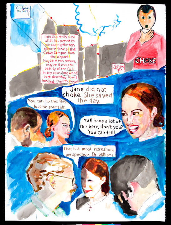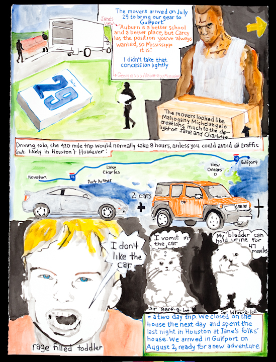 Ultimately, it made sense to me to tell the Katrina Chronicles in a form that embraces the stepchild nature of Mississippi and the leveling power of Katrina. The Chronicles are told in a visual form that hovers somewhere between a graphic novel, a journal entry, a painting, a memoir and a flippant conversation. It is pieced together on the most delicate and fragile of surfaces, paper. The work is both visually spare yet dense with narrative. Sharpie and sumi-e, acrylic and encaustic, Mylar and rice paper, and text and image are fused without hierarchy; I hope to make images that openly engage the imperfection of memory, the possibility of change and the restorative power of storytelling.